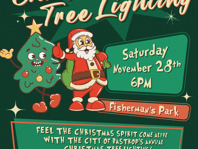 View Gallery Bastrop Christmas Tree Lighting City of Bastrop Recreation 1200 Willow Street Bastrop, TX 78602 Dates: November 28, 2025 Time: 6:00 PM to 9:00 PM Price: FREE Email Visit Website Details Feel the Christmas spirit come alive with the City of Bastrop's Annual Christmas Tree Lighting! Get together with friends and family to enjoy music, treats, and a special visit from Santa! Date: Friday, November 28thTime: Event begins at 6PM!Location: Fisherman's Park (1200 Willow St.) Map