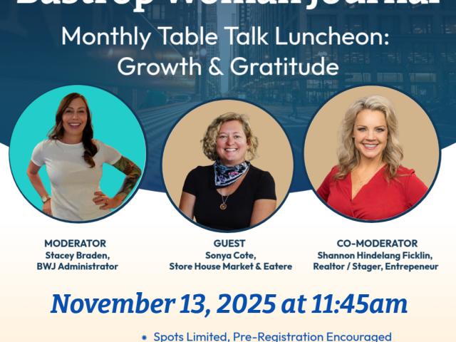 Bastrop Woman Journal Table Talk Luncheons connect, empower, and uplift all women in our community. Get inspired and network with local women who are making moves—and meaning. This is a ladies-only event. We welcome women from other cities that are visiting as well to come meet the women of this area, because connecting is our super power.